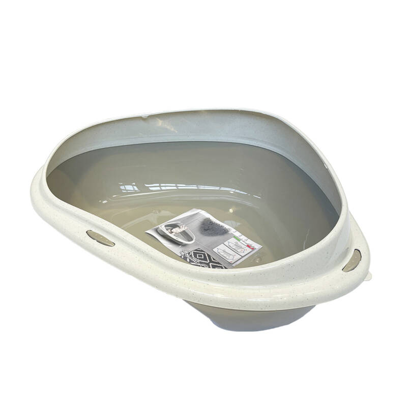 Corner cat litter tray with detectable rim. The high rim helps to keep litter in the tray. Has rounded corners to make cleaning easier.