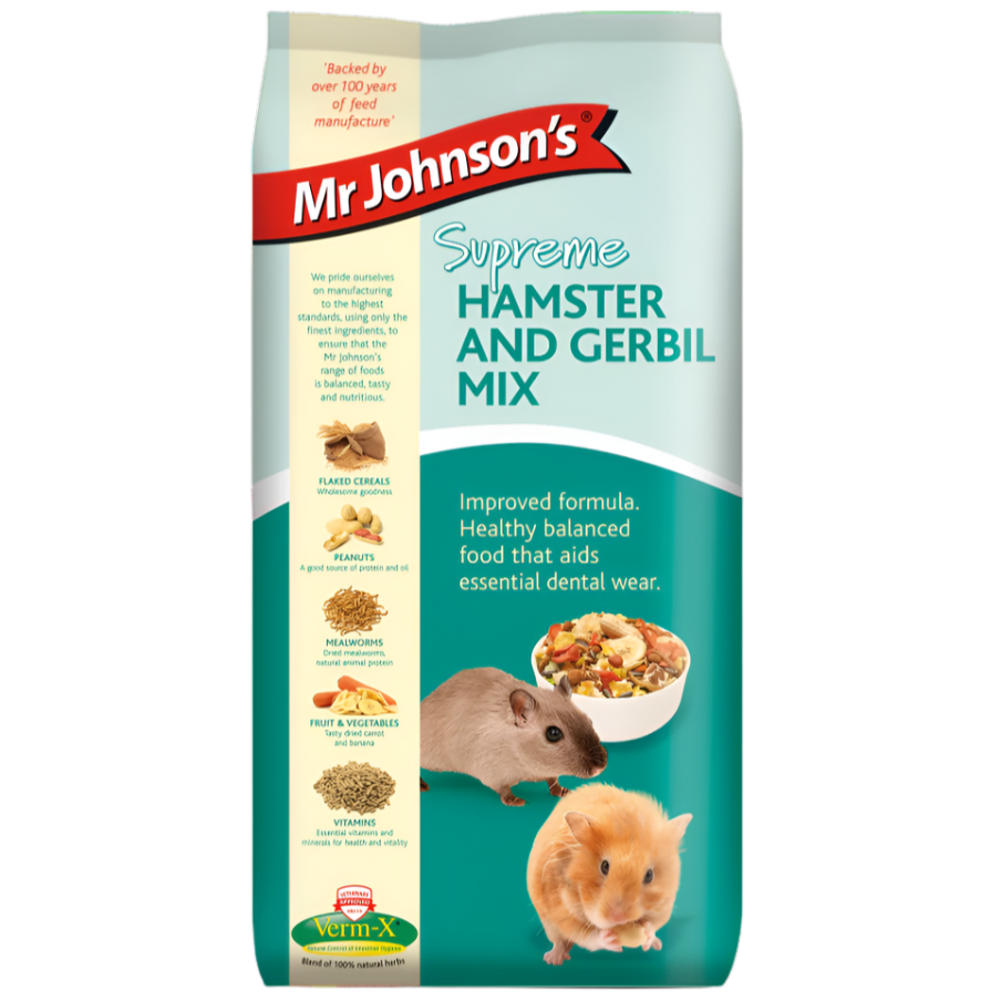 Mr Johnson’s Supreme Hamster & Gerbil Mix is a fibrous, nutritious and wholesome blend of cereals, fruit, vegetables, seeds, nuts, mealworms, pellets and extrusions – supplying Hamsters and Gerbils with a tasty, healthy food in a variety of textures to encourage the natural foraging instinct and helping in essential dental wear.